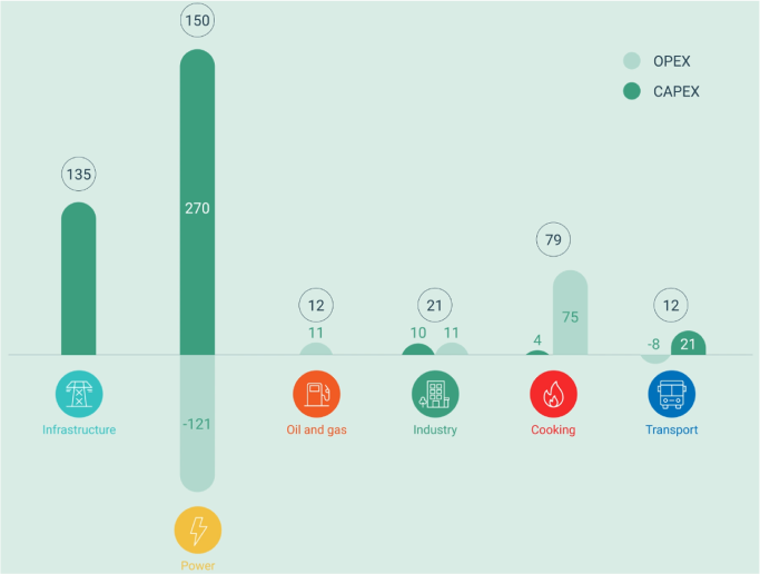 Most of the effort will be needed in the power sector: extra CAPEX is needed to finance the power sector generation capacity ($270Bn), and the T&D infrastructure ($135Bn)